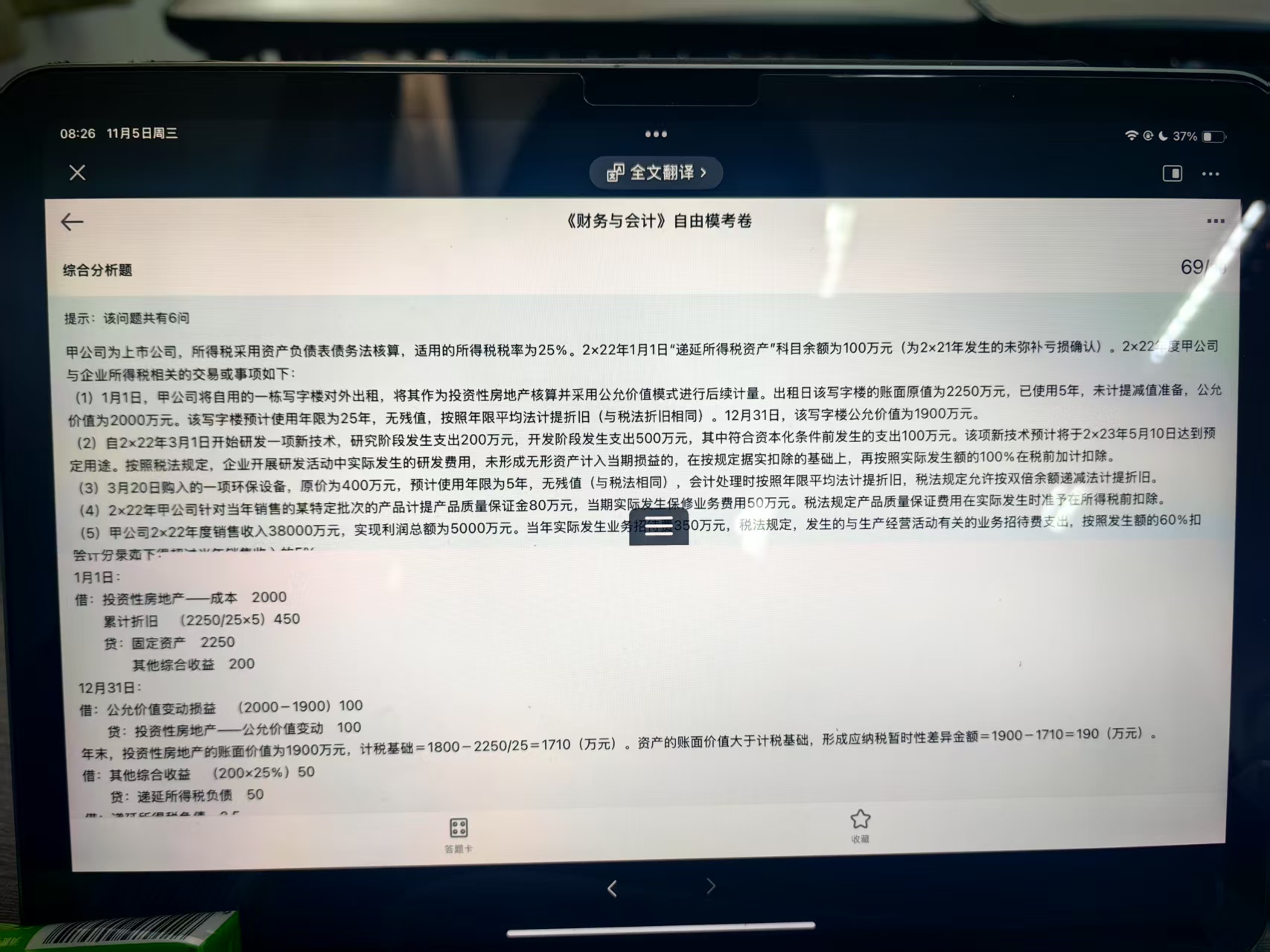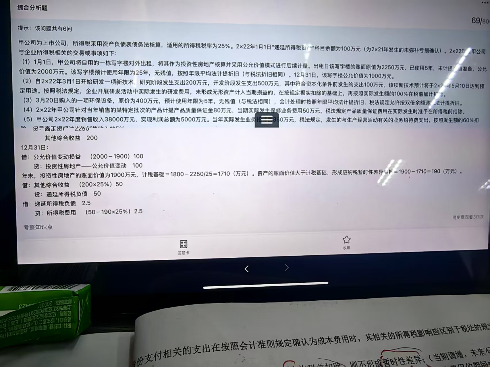 事项1中,12月31日确认所得税费用时,需考虑投资性房地产公允价值变动产生的暂时性差异。<br><br>会计上按公允价值变动确认“其他综合收益”100万元(2000-1900),但税法不认可公允价值变动,计税基础仍为账面原值减累计折旧: <br>计税基础 = 2250 - (2250/25×5) = 1800万元。 <br>而会计账面价值为1900万元,形成应纳税暂时性差异100万元(1900-1800)。<br><br>因此需确认递延所得税负债 = 100 × 25% = 25万元。 <br>但此前已确认递延所得税负债50万元(来自1月1日转换时的公允价值变动),本期应调减25万元,即:<br><br>借:递延所得税负债 25 <br>贷:所得税费用 25<br><br>这样处理是为了匹配会计与税法之间的差异,避免重复确认或遗漏。